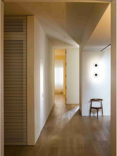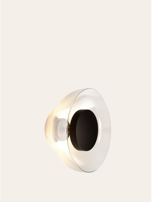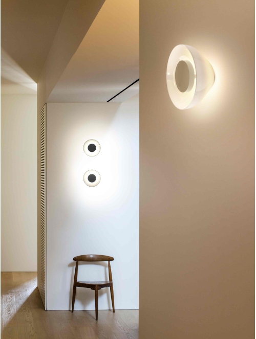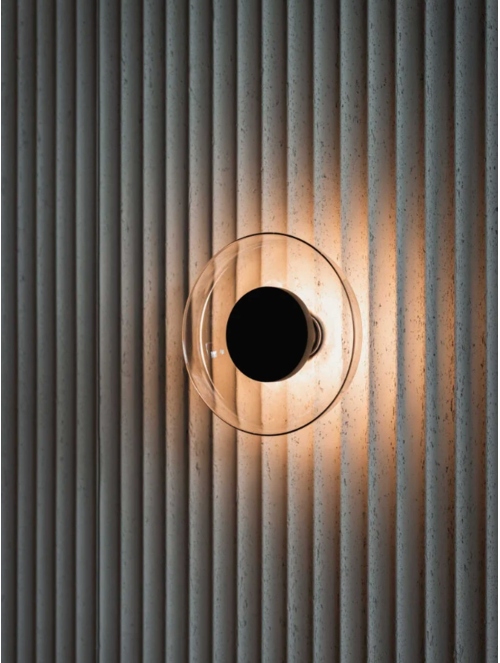 El aplique Aura se inspira en la imagen de una botella de vidrio, reinterpretada como un objeto lumínico decorativo. El vidrio opal, transparente o de color de su pantalla permite que la luz bañe la pared y cree un efecto luminoso sin estridencias que genera un punto de interés en el espacio, mientras que la fuente de luz LED queda discretamente oculta tras el disco de aluminio central.