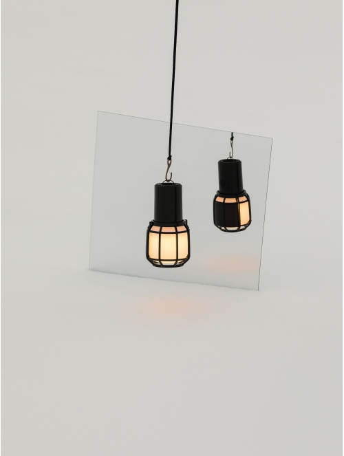 En la base, recubierta en parte por goma negra, se aloja un semiaro de metal para poder colgar la lámpara.
