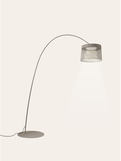 Twiggy Grid es una lámpara de pie diseñada para exterior, con una estructura arqueada y una pantalla calada que proyecta una luz directa y gráfica. Su diseño combina elegancia y resistencia, ideal para crear atmósferas acogedoras al aire libre.