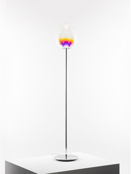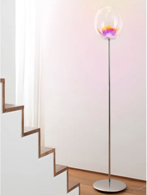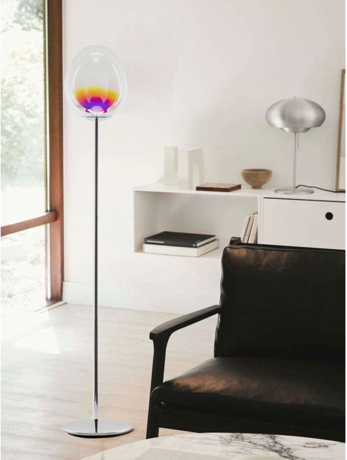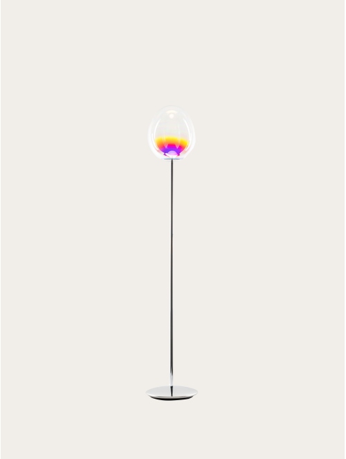 Esta lámpara combina la artesanía del vidrio soplado con un innovador acabado PVD iridiscente, creando un efecto de luz único y dinámico. Su diseño esférico, junto con una estructura ligera, aporta sofisticación a cualquier espacio.
