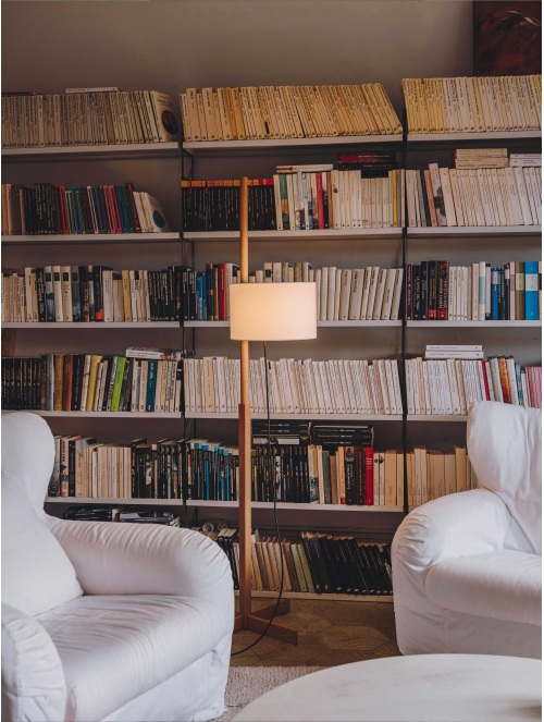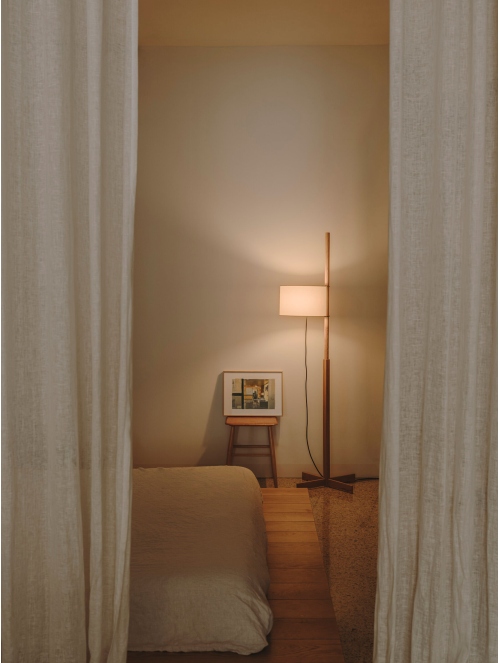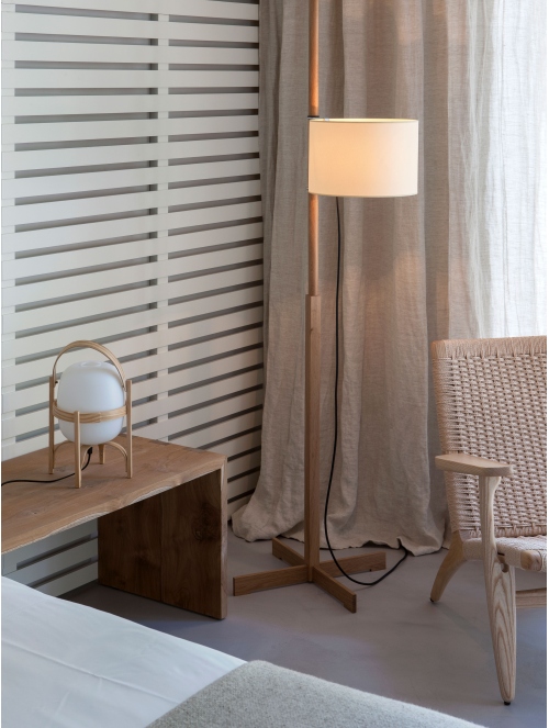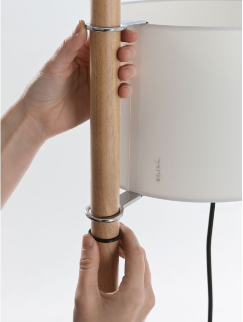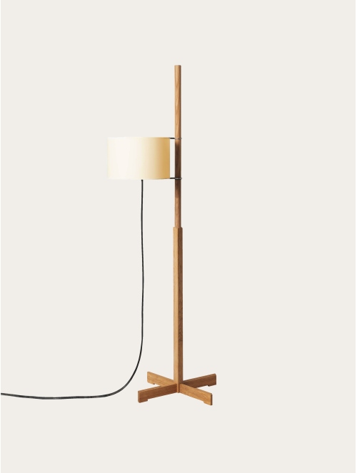 Entrega 3-5 semanas para fabricación.Una lámpara de pie que equilibra sobriedad y funcionalidad. Su diseño incorpora una estructura de madera con pantalla de algodón que se regula en altura mediante un sencillo sistema de contrapeso, activándose por una clásica tira de encendido.