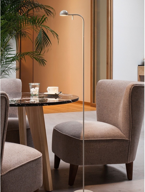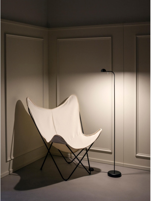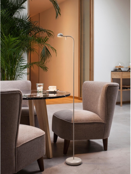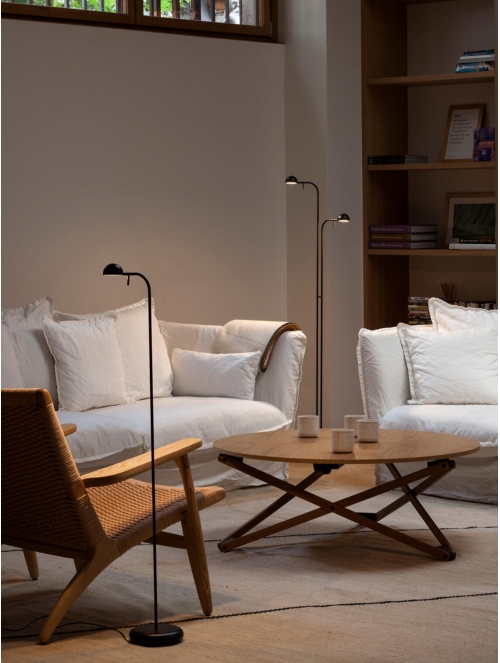 La lámpara de pie Pin es una propuesta minimalista y poética. Su estructura ligera sostiene un cabezal orientable que permite dirigir la luz de manera precisa, ofreciendo una iluminación cálida y acogedora para lectura o rincones íntimos.