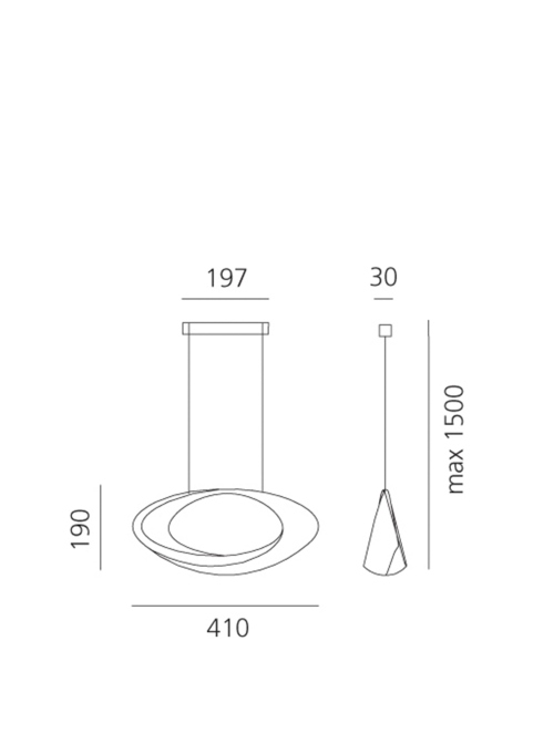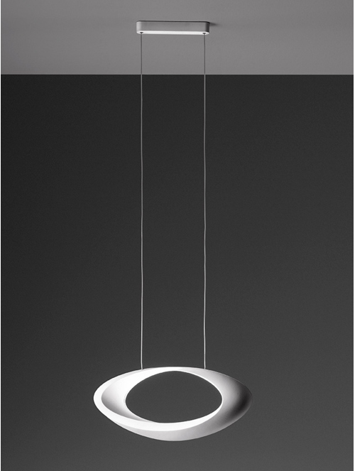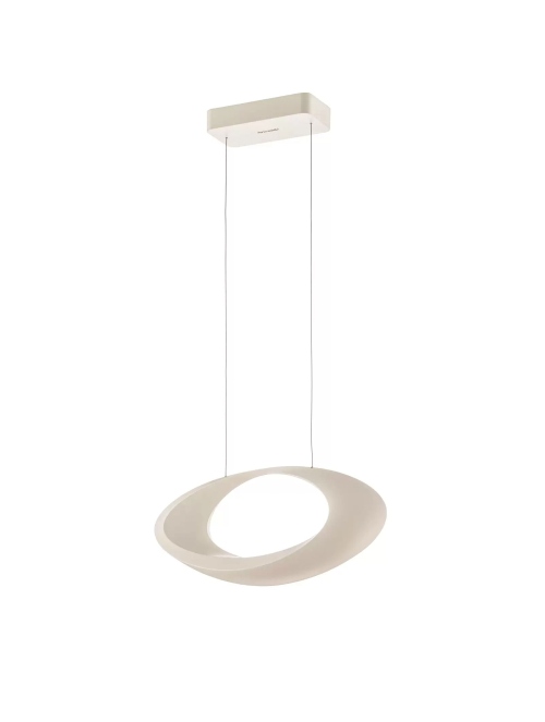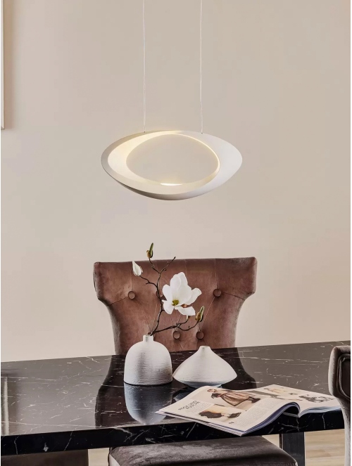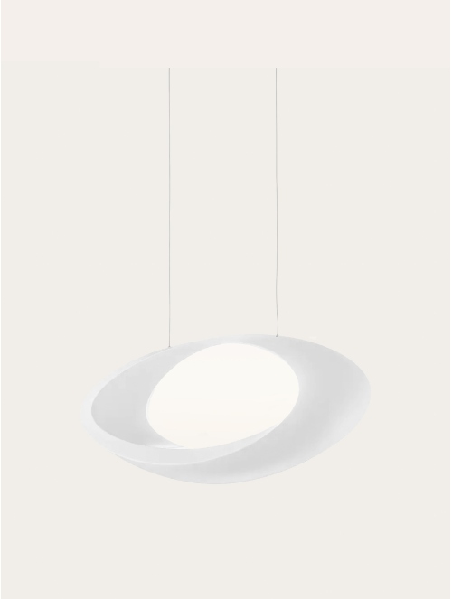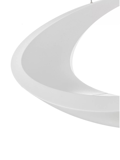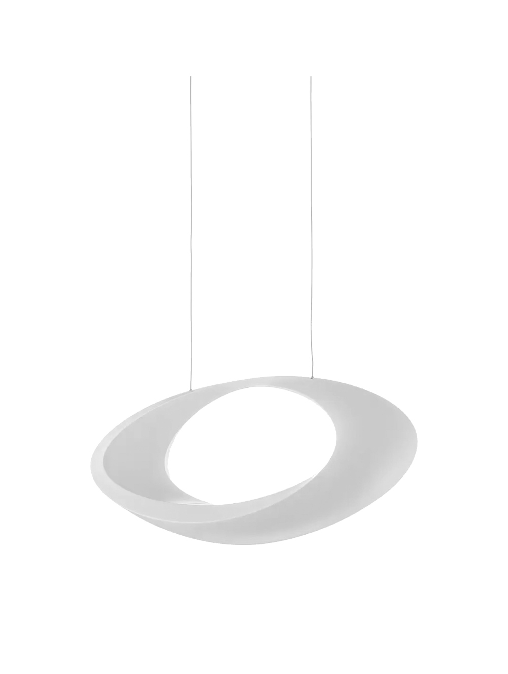 Lámpara de suspensión con un diseño contemporáneo, con su forma sinuosa que crea un efecto de anillo luminoso. La emisión de luz indirecta resalta su estructura, proporcionando una iluminación difusa y confortable en cualquier espacio.