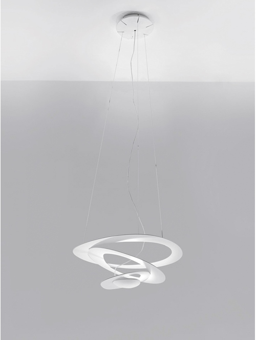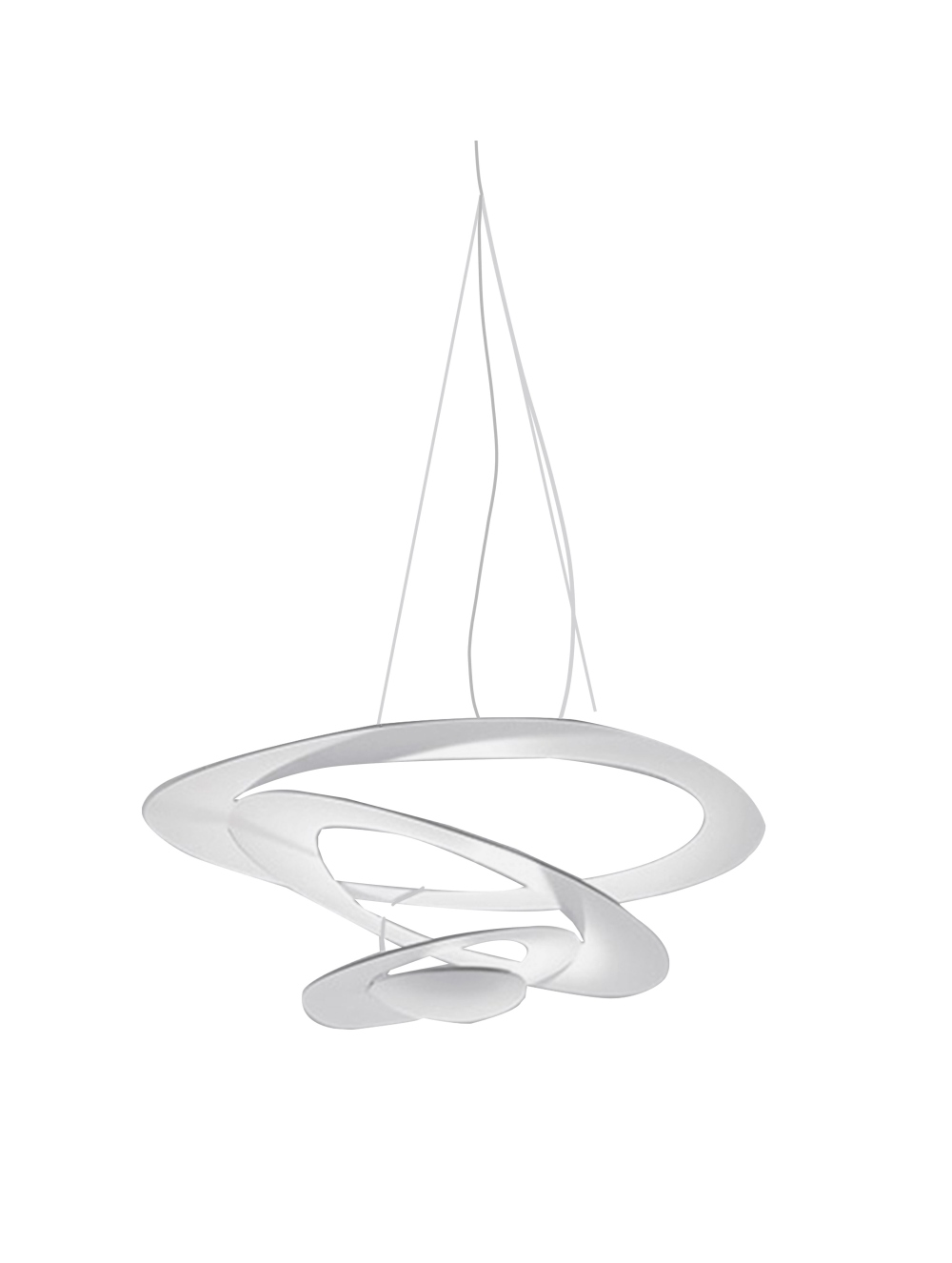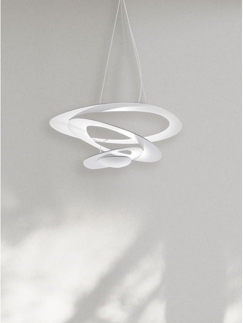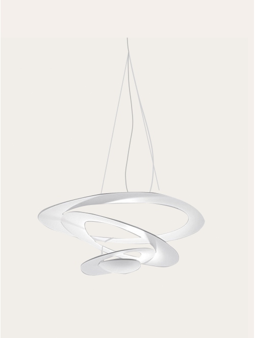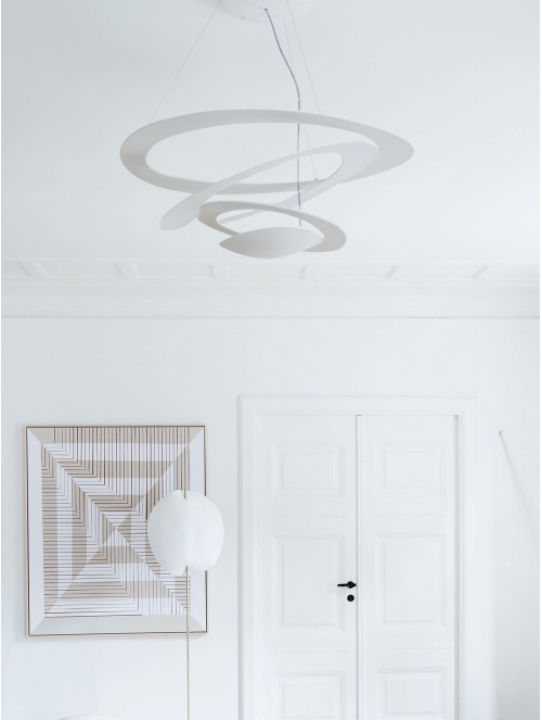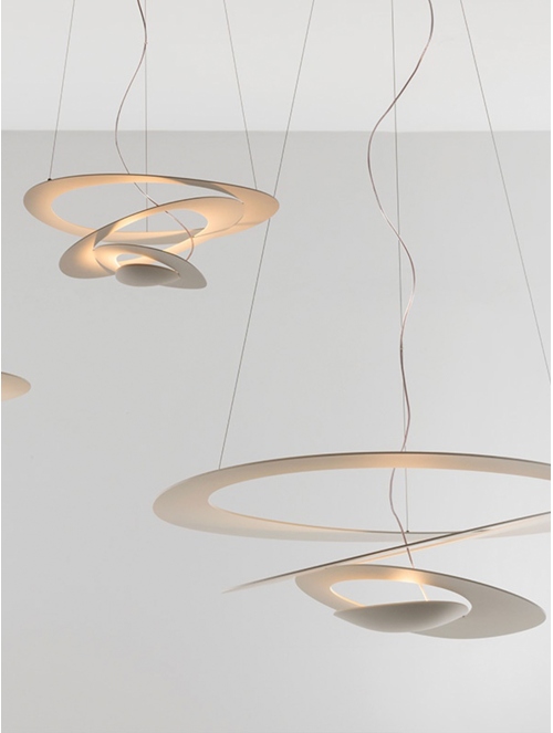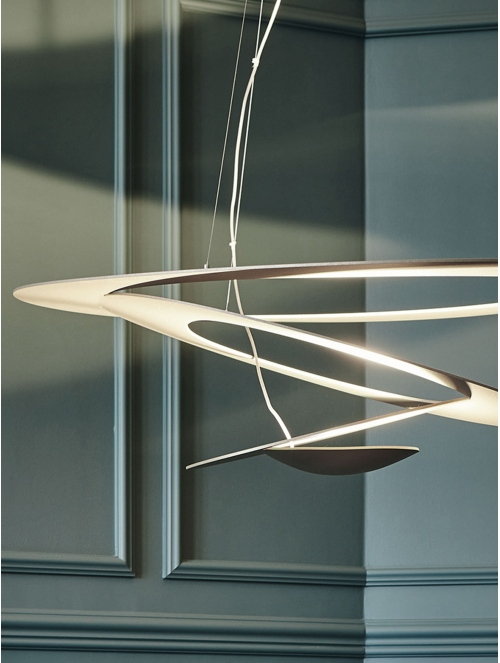Con un diseño escultural juega con formas fluidas y dinámicas. Sus anillos de aluminio crean un efecto visual llamativo mientras proyectan una iluminación indirecta y envolvente, perfecta para realzar cualquier ambiente con un toque elegante y contemporáneo.