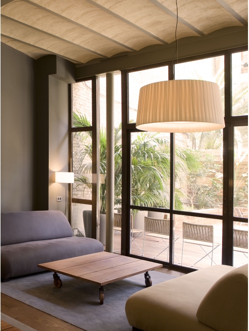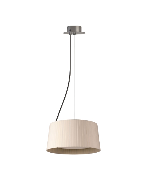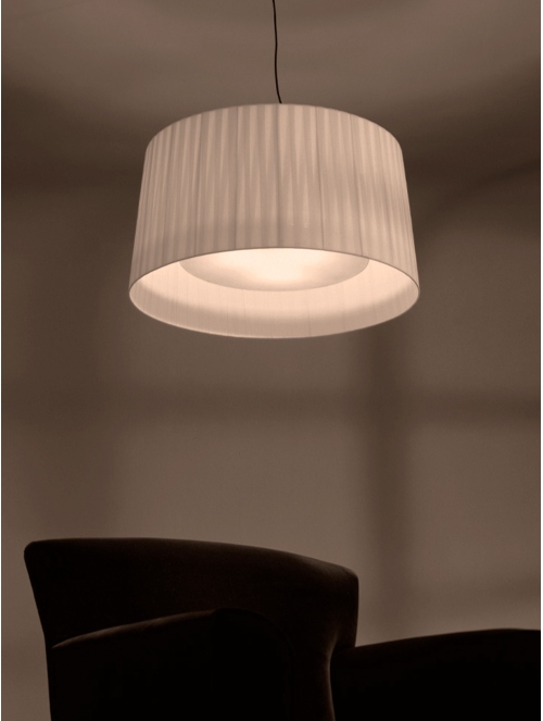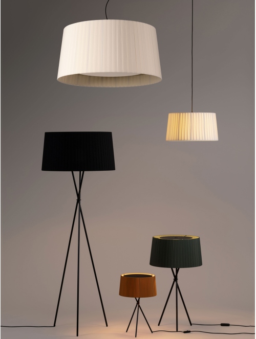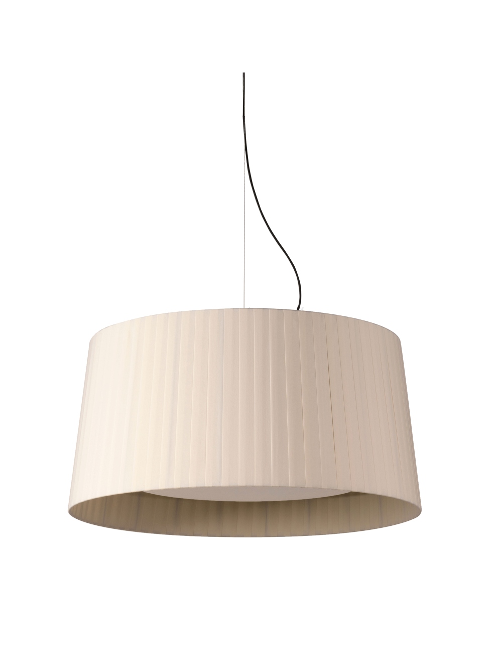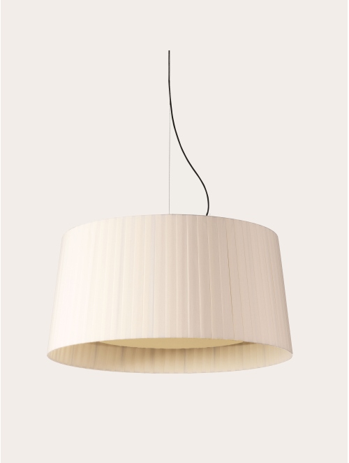 La GT7 es el modelo de gran formato de la familia GT. Con una pantalla de cinta de algodón cruda de gran diámetro, esta luminaria está diseñada para ofrecer una presencia elegante y una iluminación cálida y difusa en espacios amplios. Ideal para salones, halls o zonas comunes de grandes dimensiones.