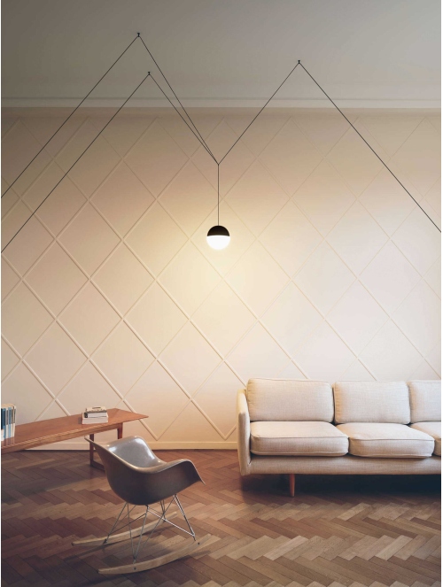 Entrega 3-5 semanas para fabricación.String Light Sphere es una luminaria colgante que ofrece una luz difusa y cálida, con un cuerpo esférico en aluminio y un difusor opal de policarbonato. Su cable de suspensión puede llegar a 12 m, permitiendo composiciones creativas en cualquier espacio.