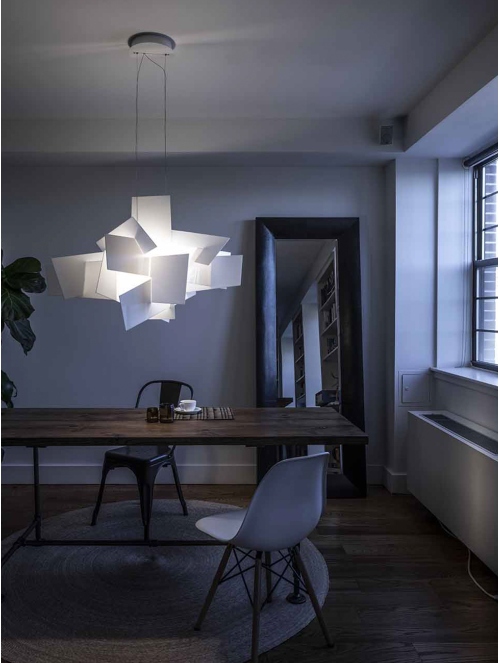 Entrega 3-5 semanas para fabricación.Big Bang es una luminaria de suspensión escultórica formada por paneles de metacrilato cruzados que, junto al disco LED integrado, crean un diseño ligero, dinámico y de fuerte impacto visual, ideal para espacios contemporáneos con personalidad