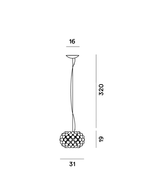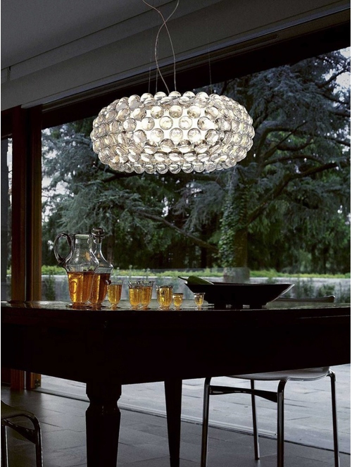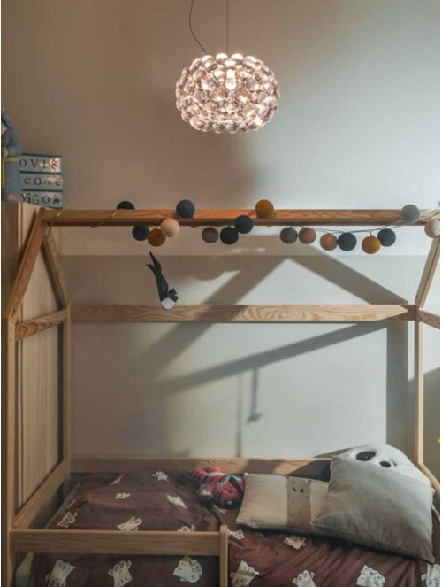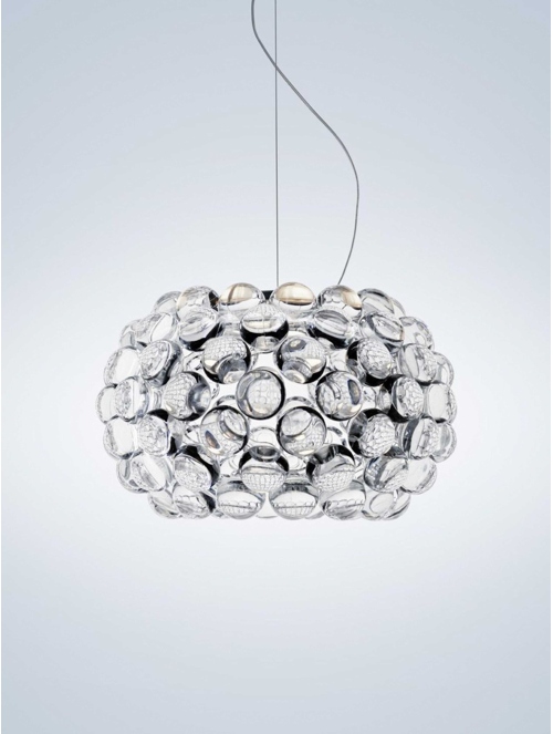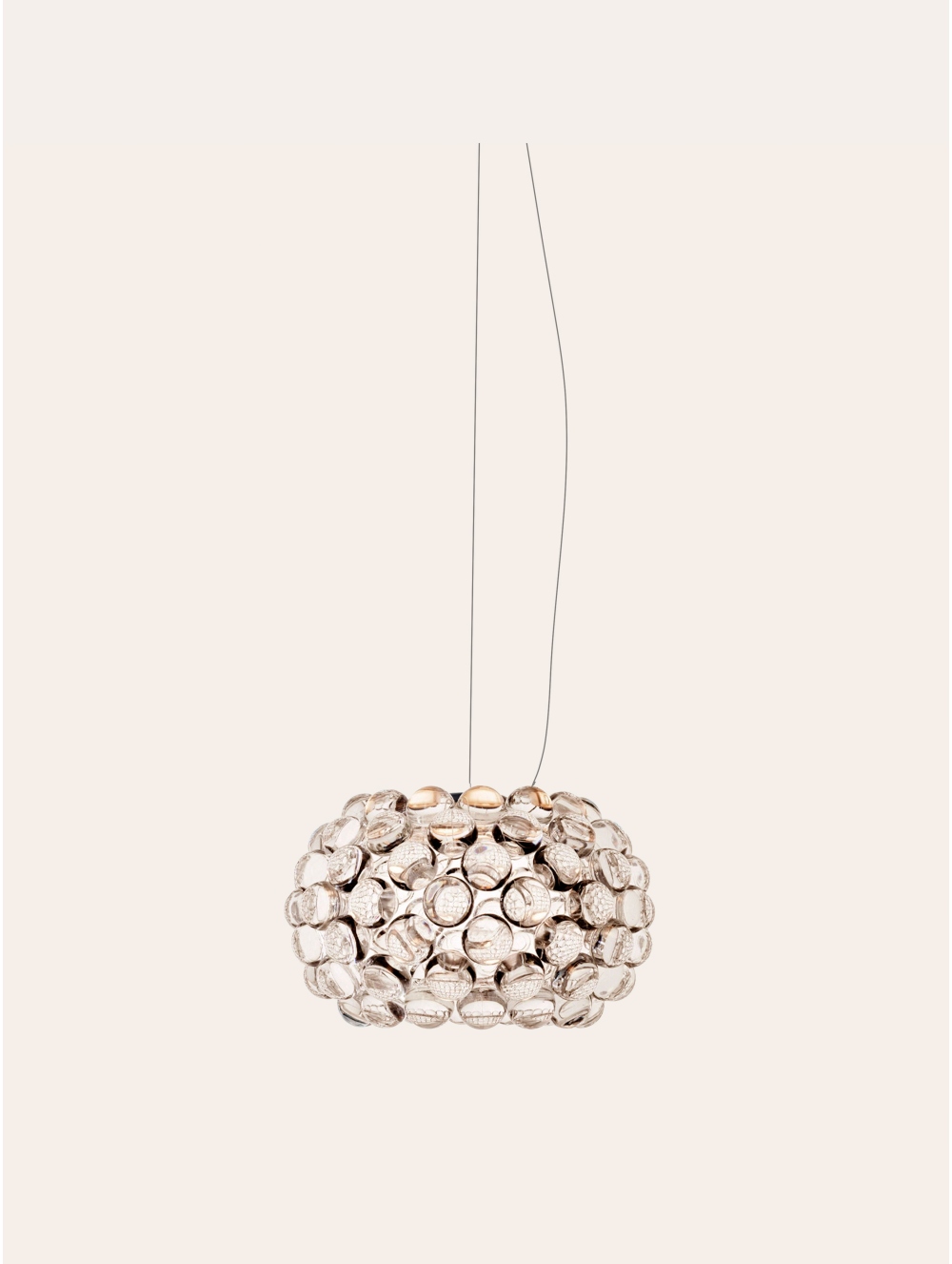 Caboche es una lámpara de suspensión que transforma la luz en una joya. Su estructura, compuesta por una malla de esferas acrílicas transparentes, multiplica la luminosidad del difusor interno y crea un efecto brillante y envolvente. Disponible en tres tamaños Pequeña, Media y Grande.